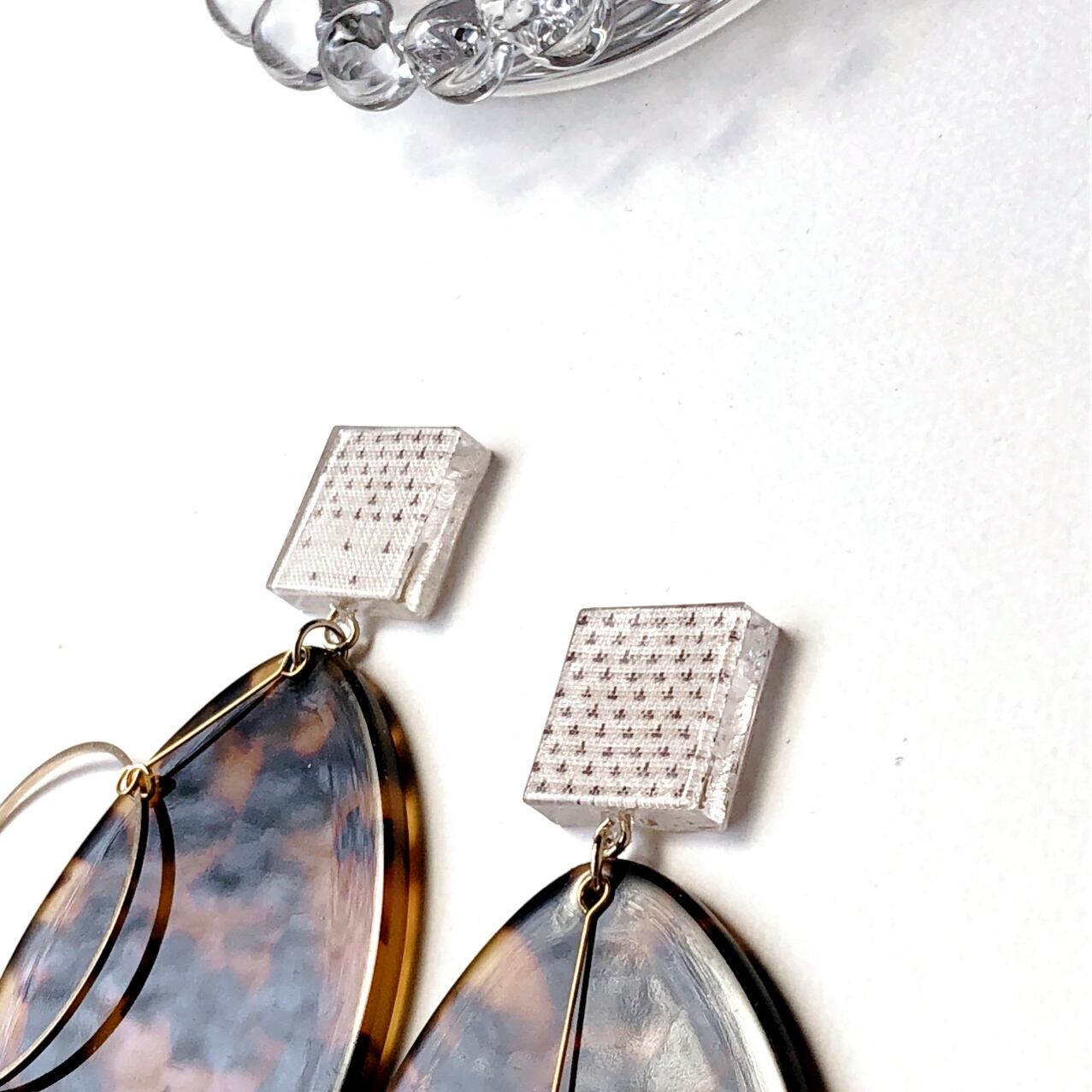 大島紬をレジンで封入し、卵型のマーブルプラパーツを装飾しました。
