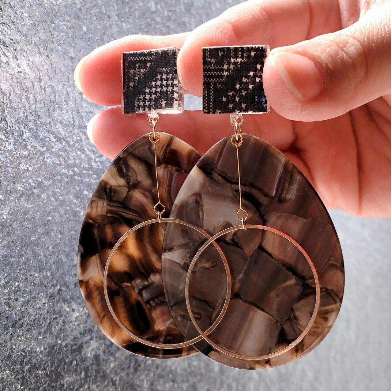 大島紬をレジンで封入し、卵型のマーブルプラパーツを装飾しました。