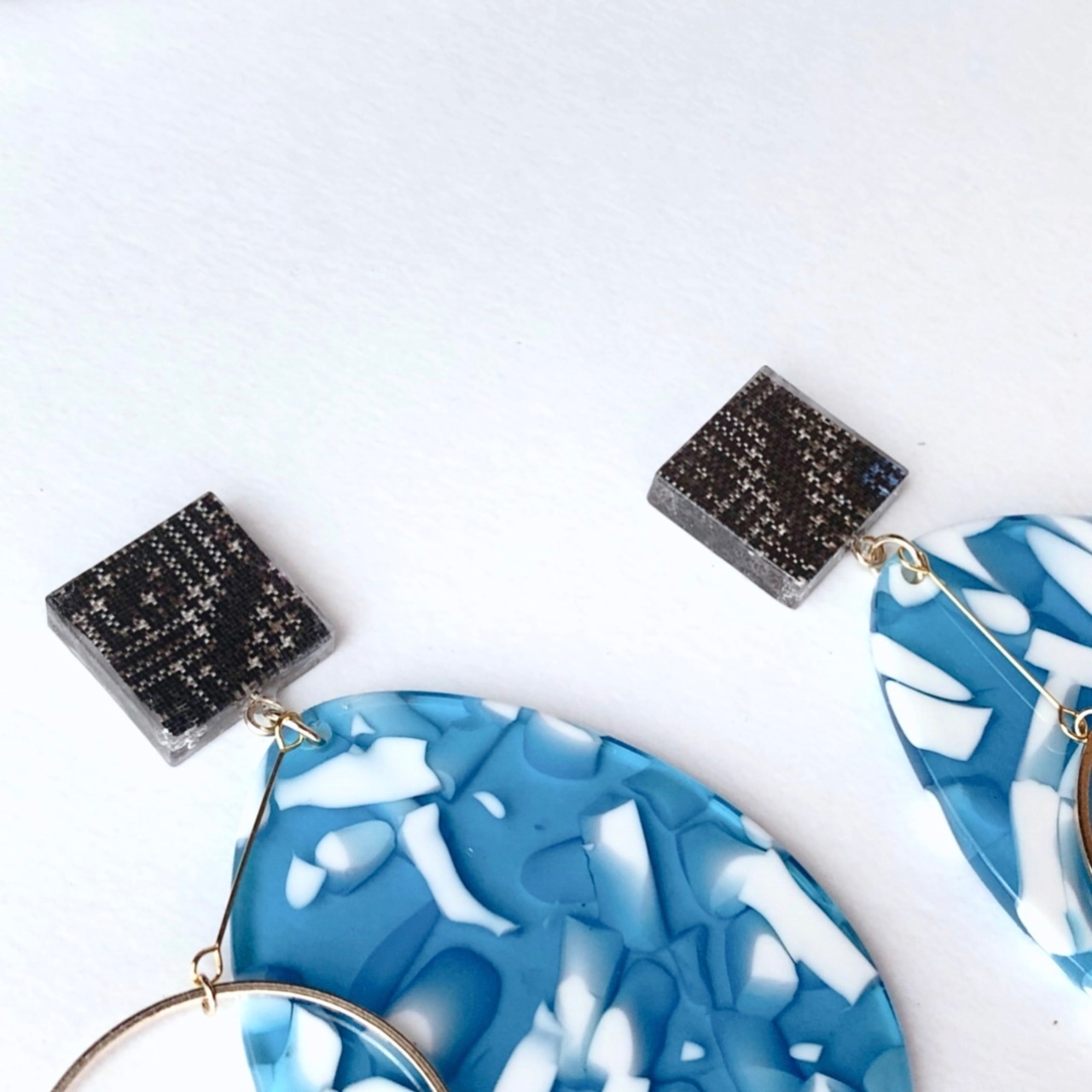 大島紬をレジンで封入し、卵型のマーブルプラパーツを装飾しました。