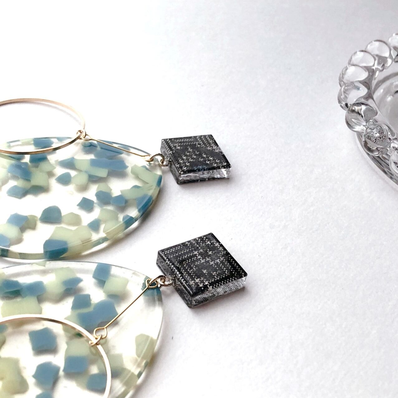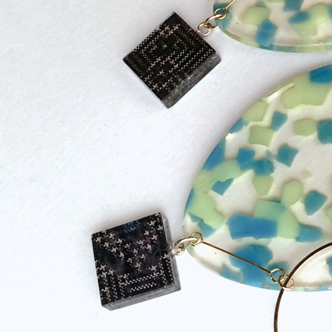 大島紬をレジンで封入し、卵型のマーブルプラパーツを装飾しました。